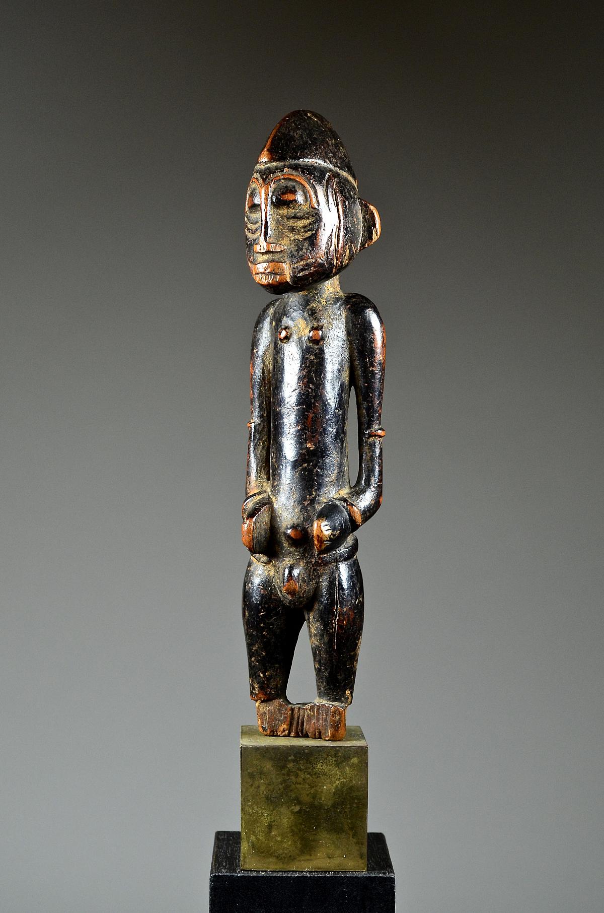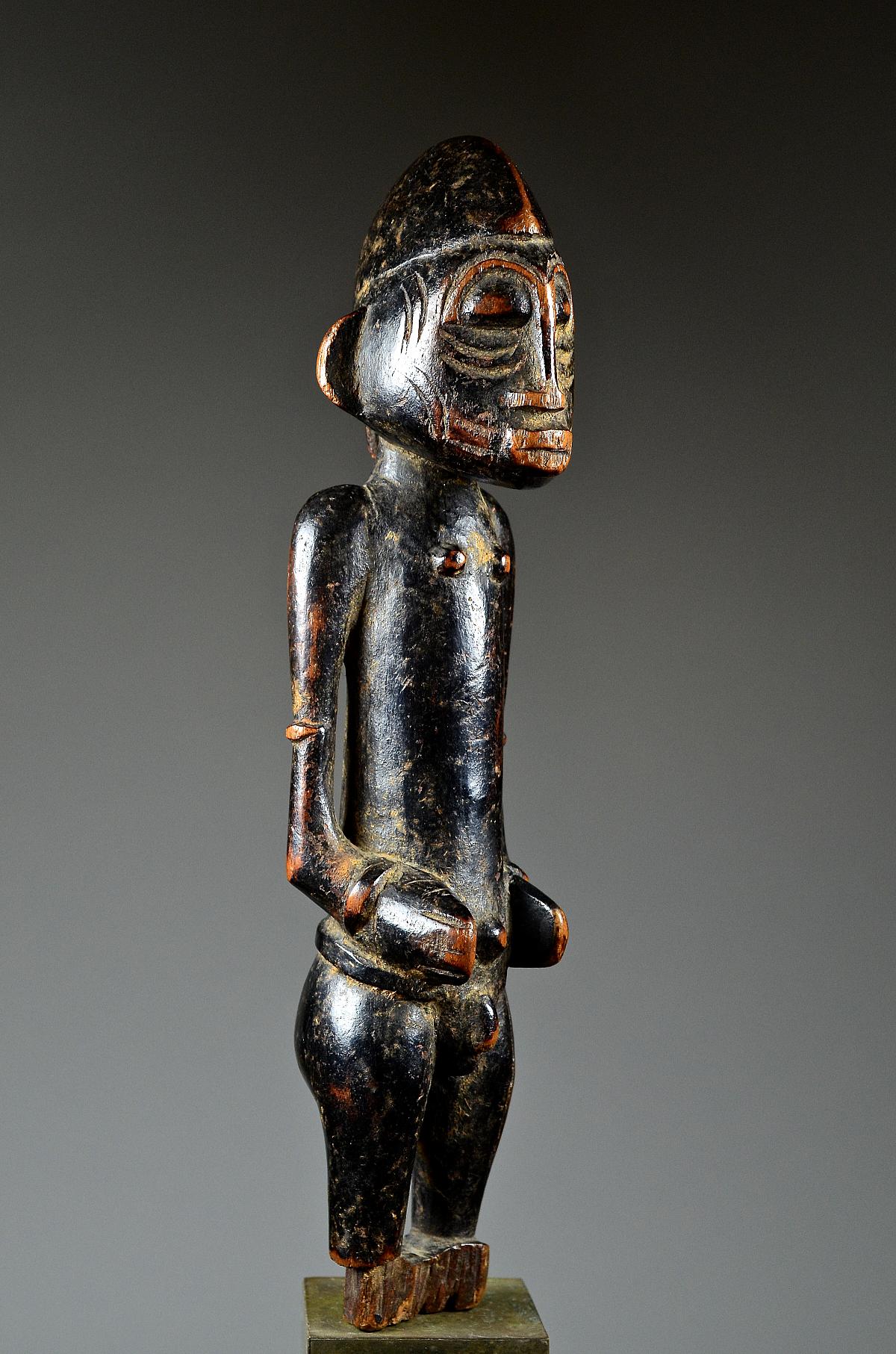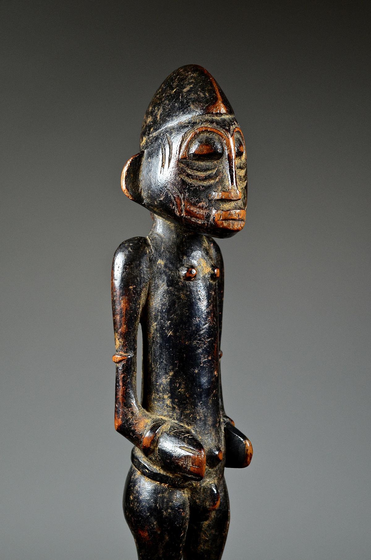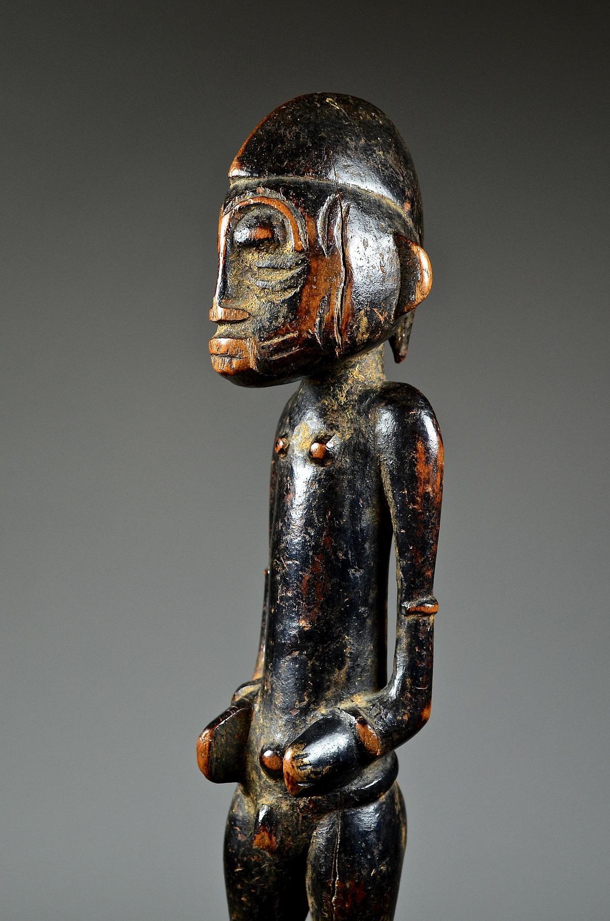 These figures, made of wood and dyed black, represent helpful bush spirits called 'Tugubele'. They belong to the local ritual experts of the Senufo people, ‘assisting’ them with their oracles and predictions. The present, standing male Tugubele figure’ is very finely executed. In perfect Senufo style, with a typical hair style, facial scarification marks and ornaments, small breasts. With visibly old 'used' patina.