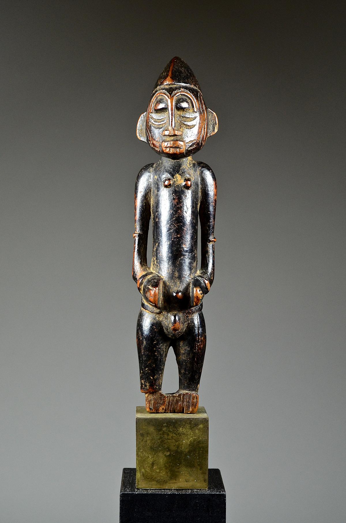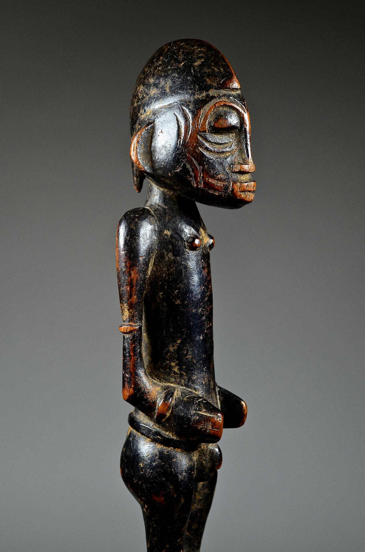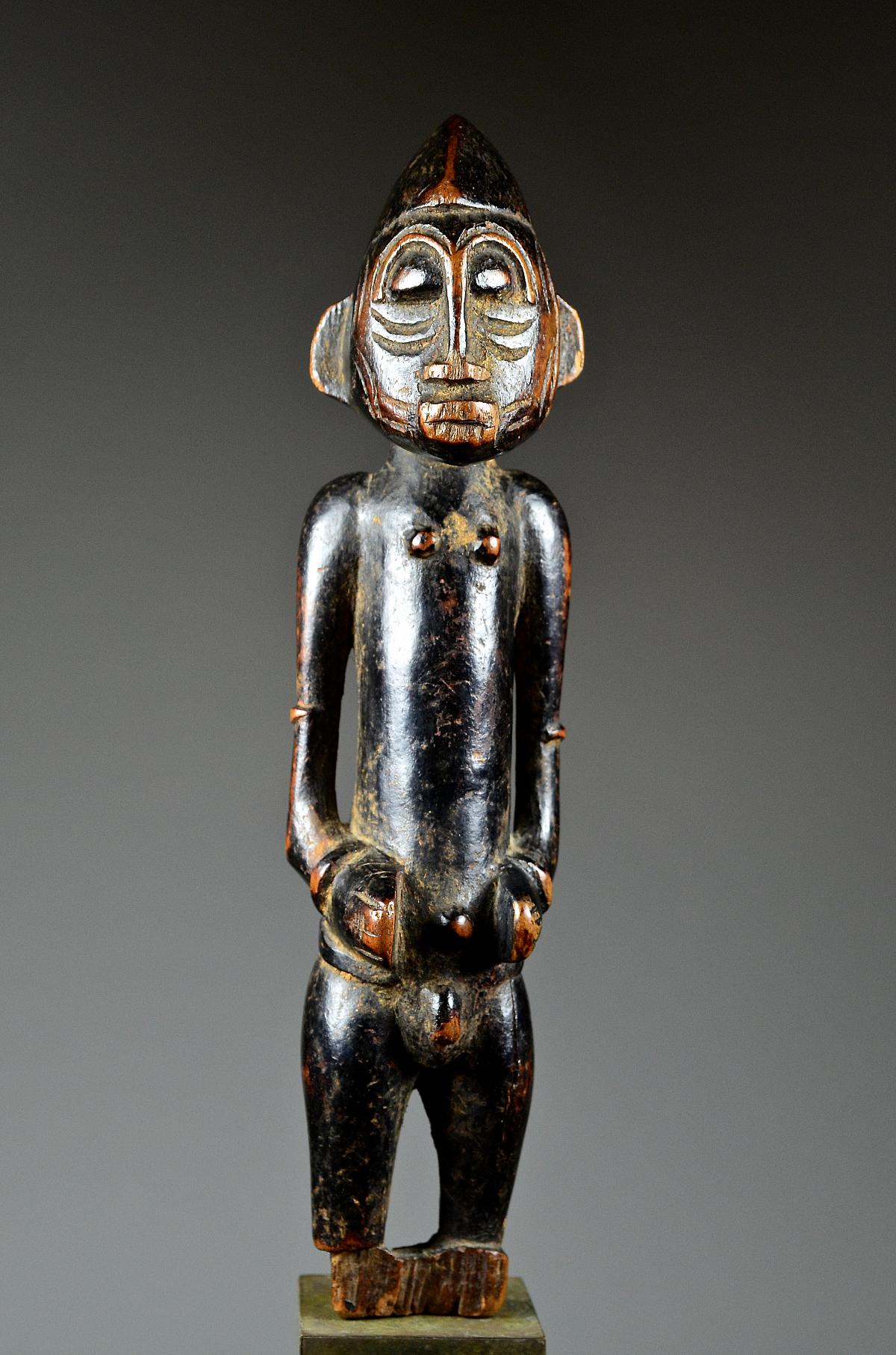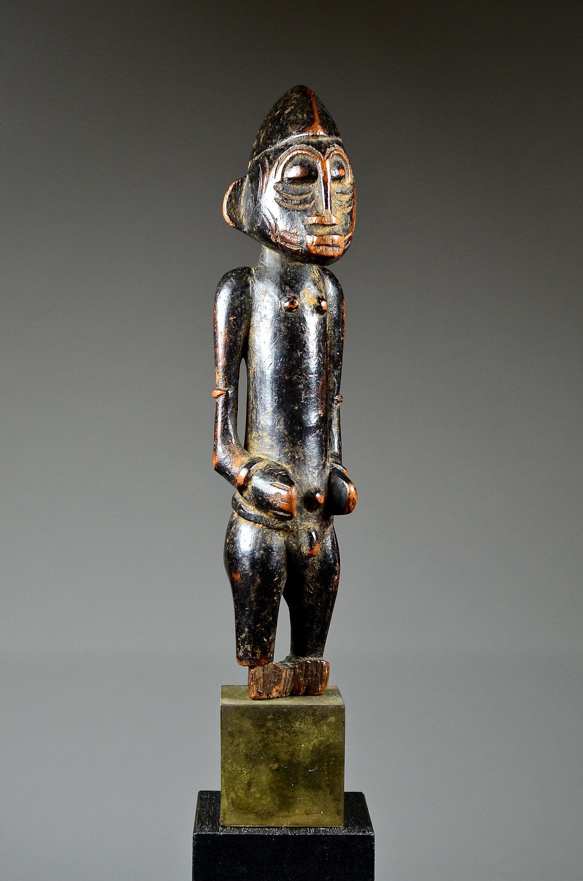These figures, made of wood and dyed black, represent helpful bush spirits called 'Tugubele'. They belong to the local ritual experts of the Senufo people, ‘assisting’ them with their oracles and predictions. The present, standing male Tugubele figure’ is very finely executed. In perfect Senufo style, with a typical hair style, facial scarification marks and ornaments, small breasts. With visibly old 'used' patina.