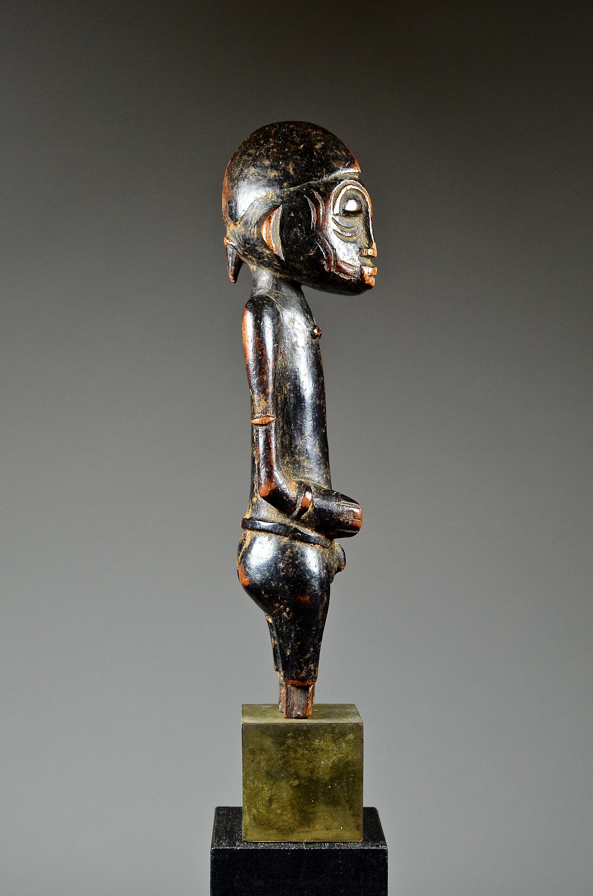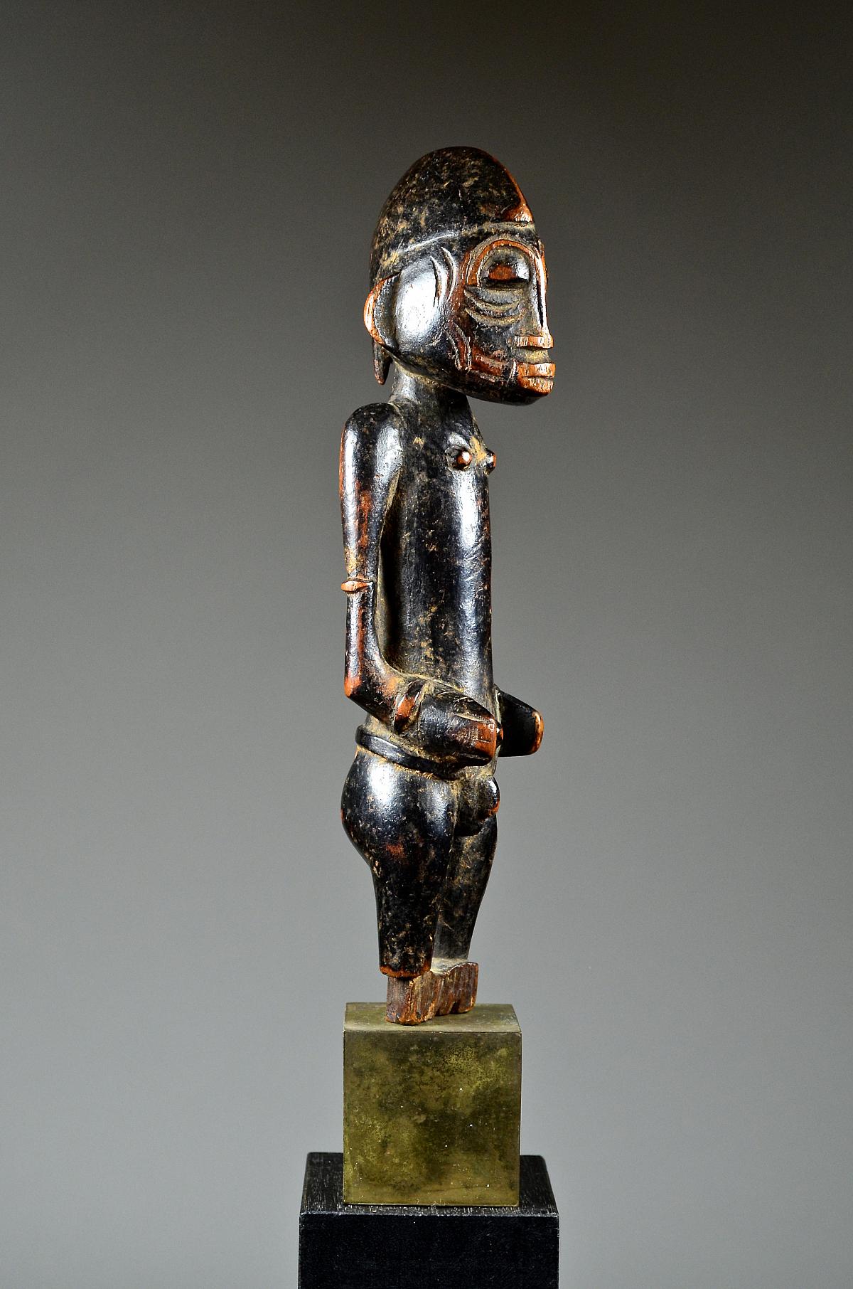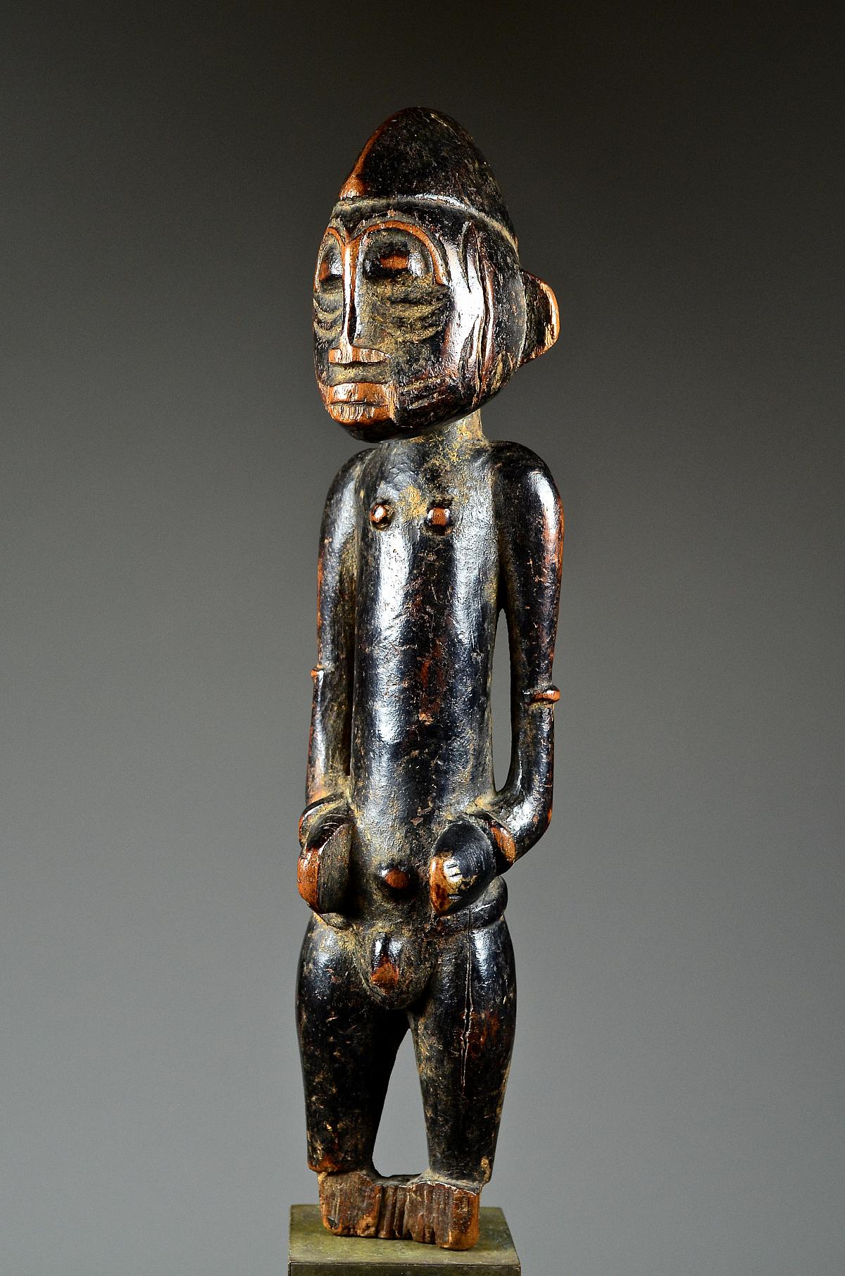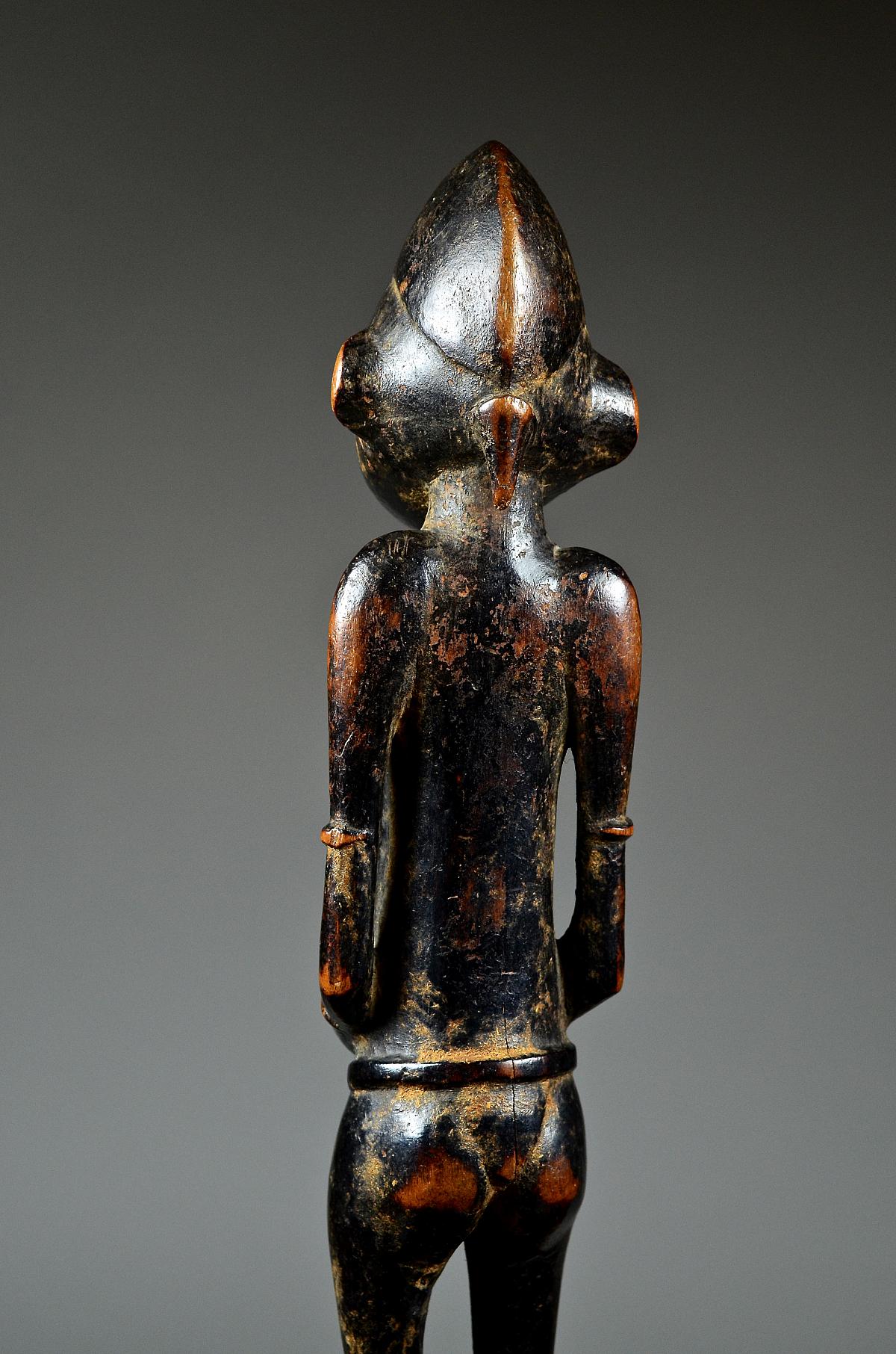 These figures, made of wood and dyed black, represent helpful bush spirits called 'Tugubele'. They belong to the local ritual experts of the Senufo people, ‘assisting’ them with their oracles and predictions. The present, standing male Tugubele figure’ is very finely executed. In perfect Senufo style, with a typical hair style, facial scarification marks and ornaments, small breasts. With visibly old 'used' patina.
